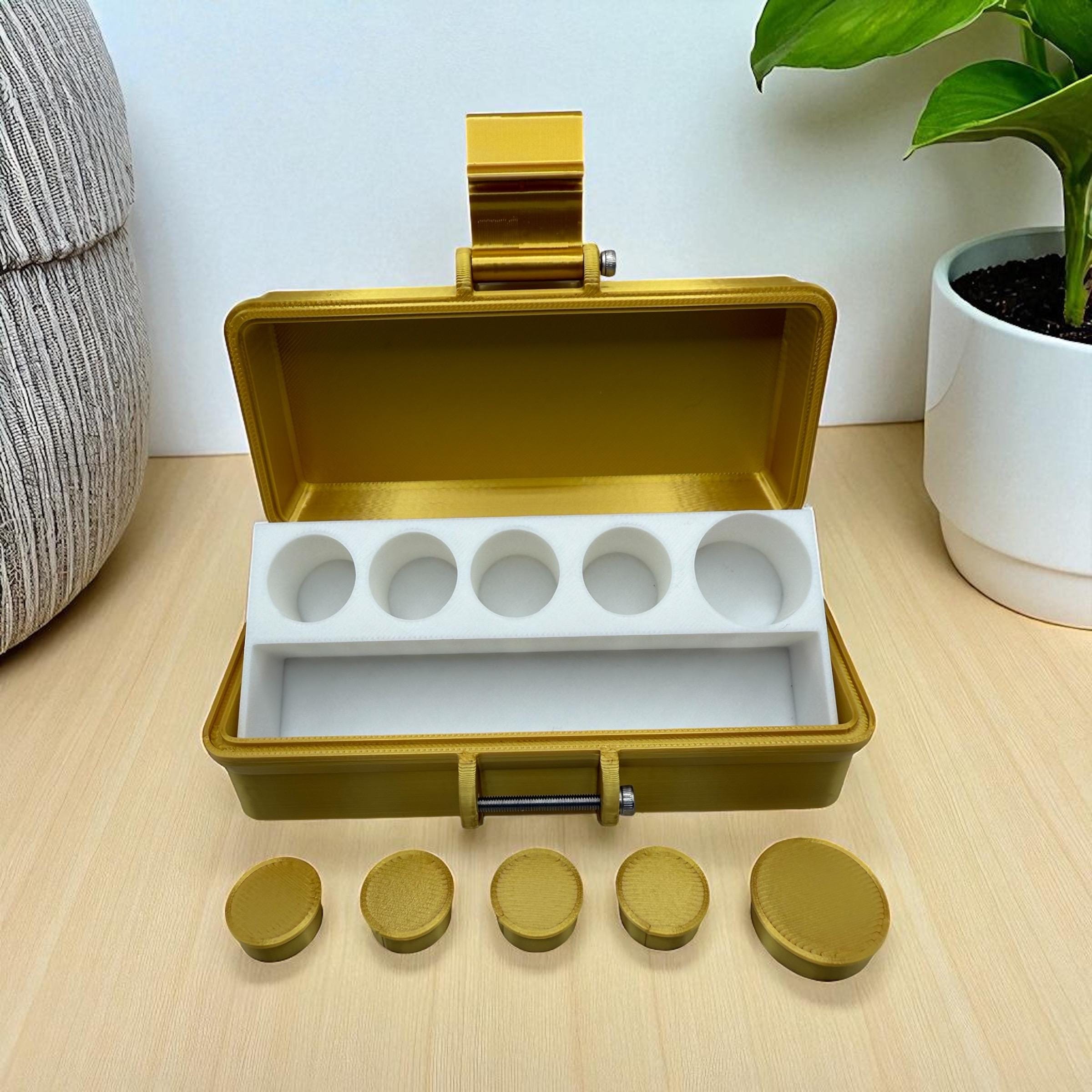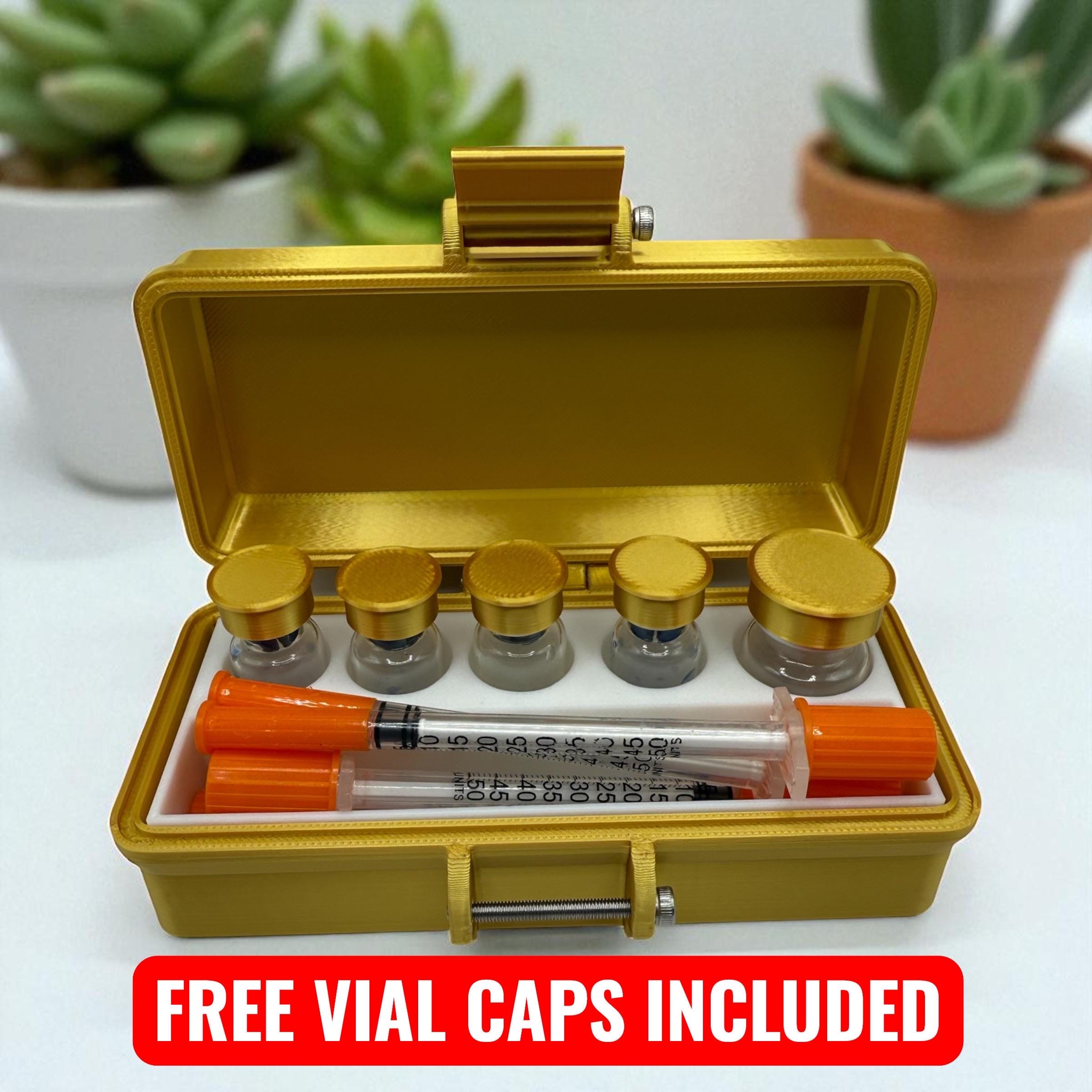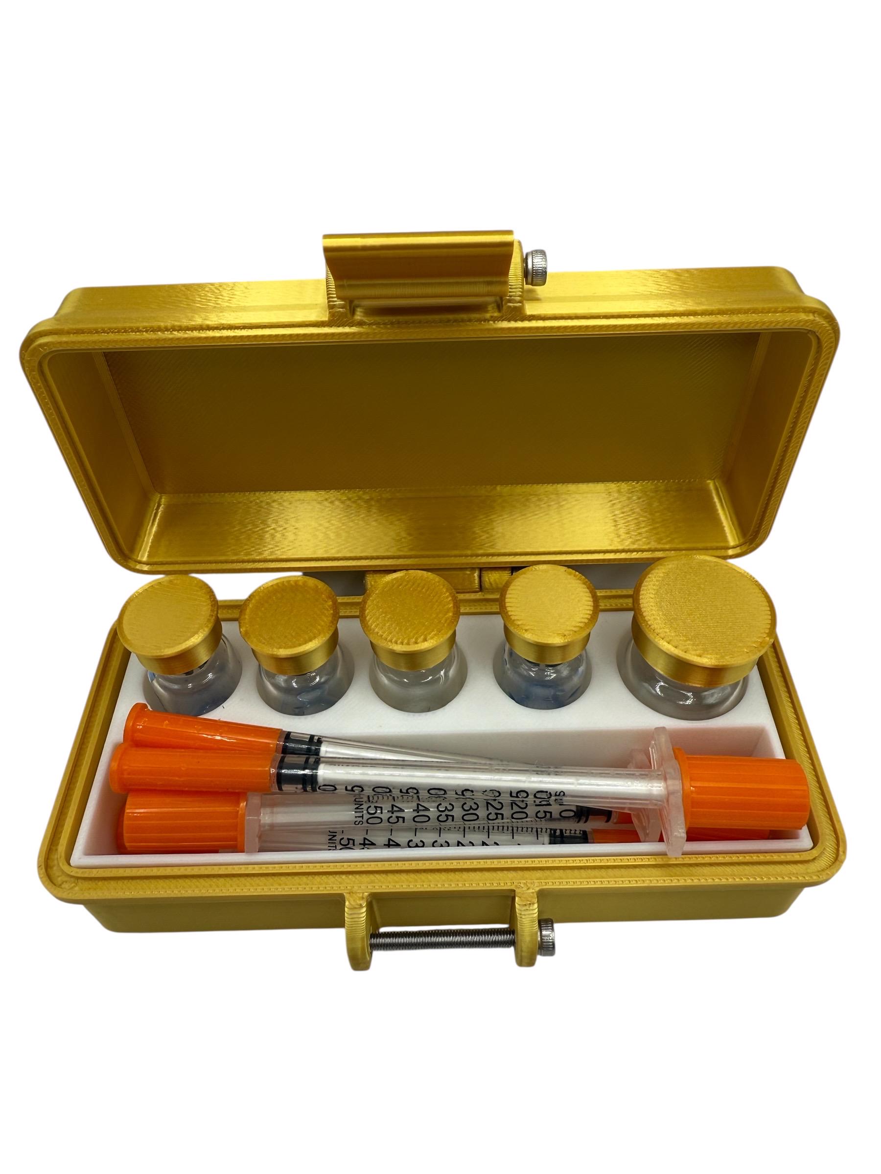Perfect for collectors, labs, and hobbyists, this compact unit securely holds 4 x 3ml vials, 1 x 5ml vial, and up to 4 insulin syringes. Despite its capacity, the storage system is mini, portable, and no larger than a single insulin syringe unit.