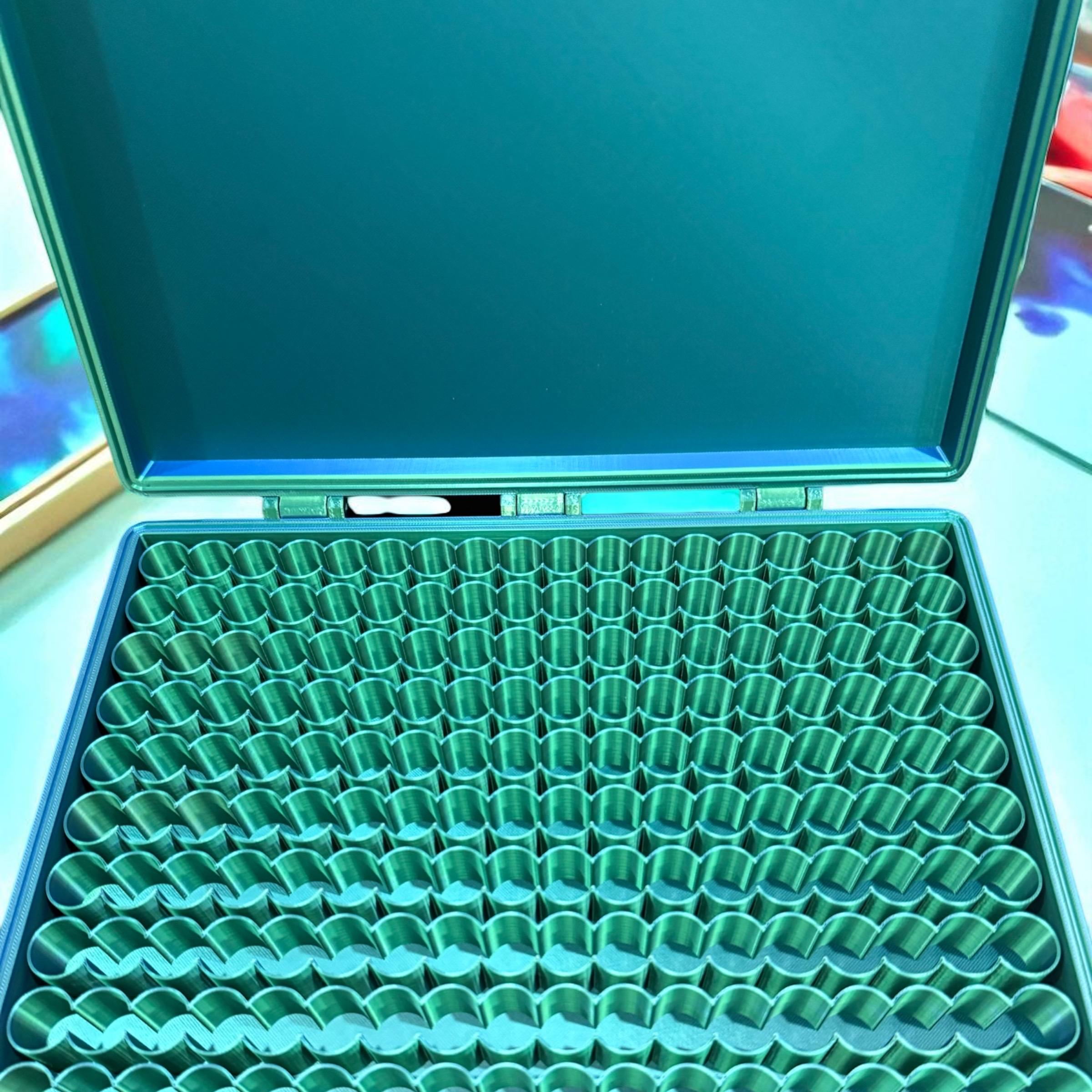 Dimensions: • Designed for standard 3ml vials (approx. 16mm diameter × 37mm height). • Case capacity: 180 slots precisely sized for a snug fit.