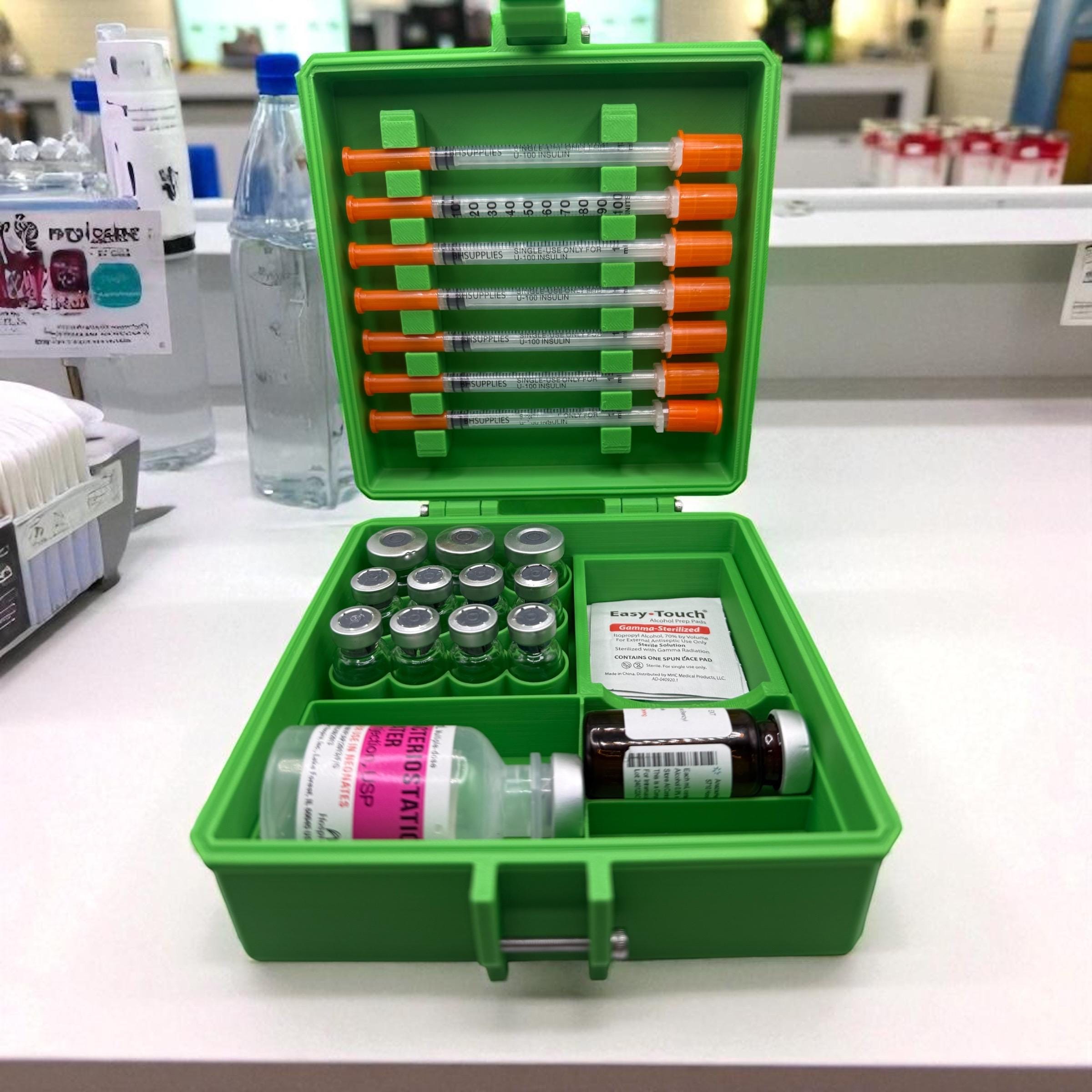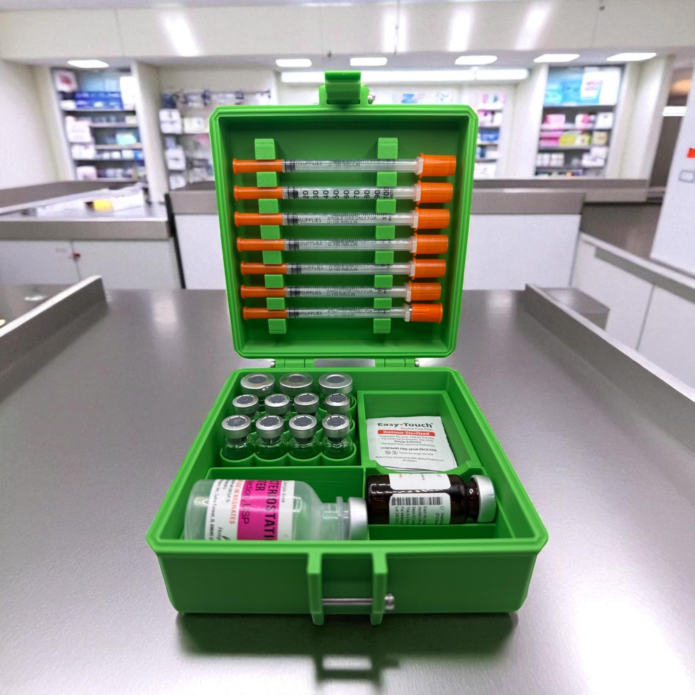 Keep your vials and supplies safe, organized, and always within reach with this compact storage box. Designed with custom compartments, it can hold multiple vial sizes, syringes, and alcohol pads in one secure case.