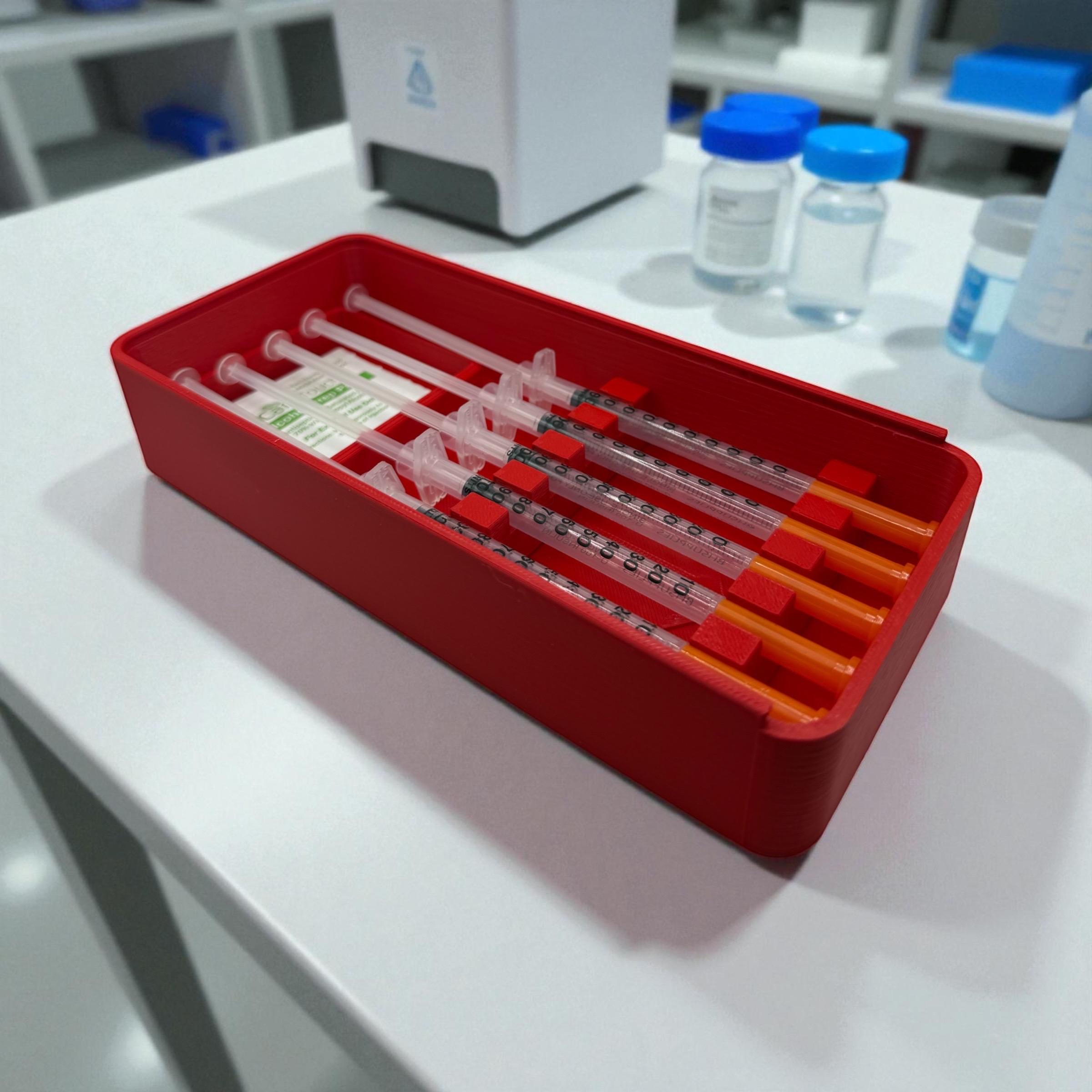 Keep your syringes safe and organized with this slim sliding case. Perfect for storing syringes along with alcohol pads, it’s lightweight, durable, and 3D-printed to order. The sliding lid keeps everything secure while allowing quick, hassle-free access. Its compact size fits easily in a drawer, freezer, or travel bag, making it ideal for peptides, insulin, testosterone, botox filler or other injectables.