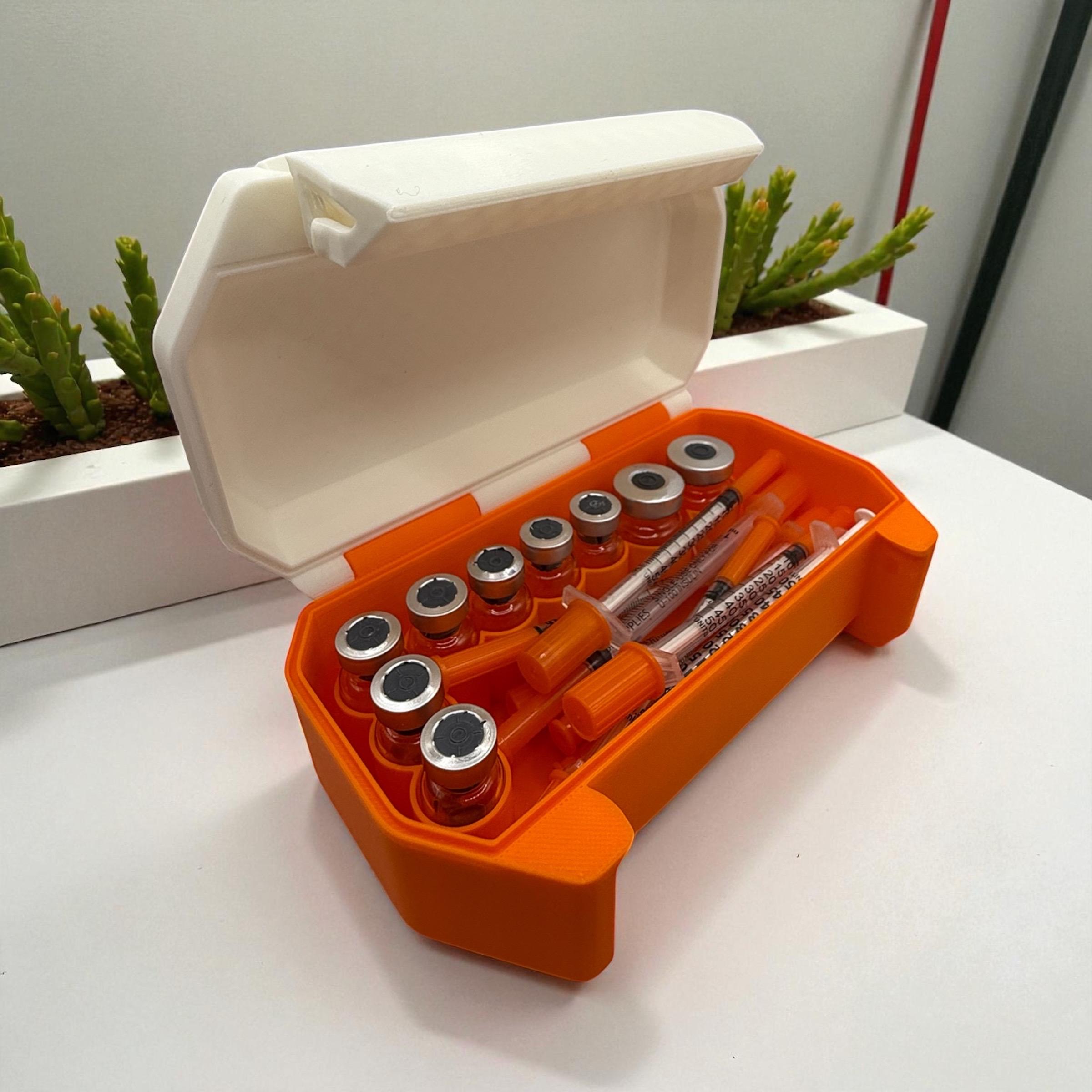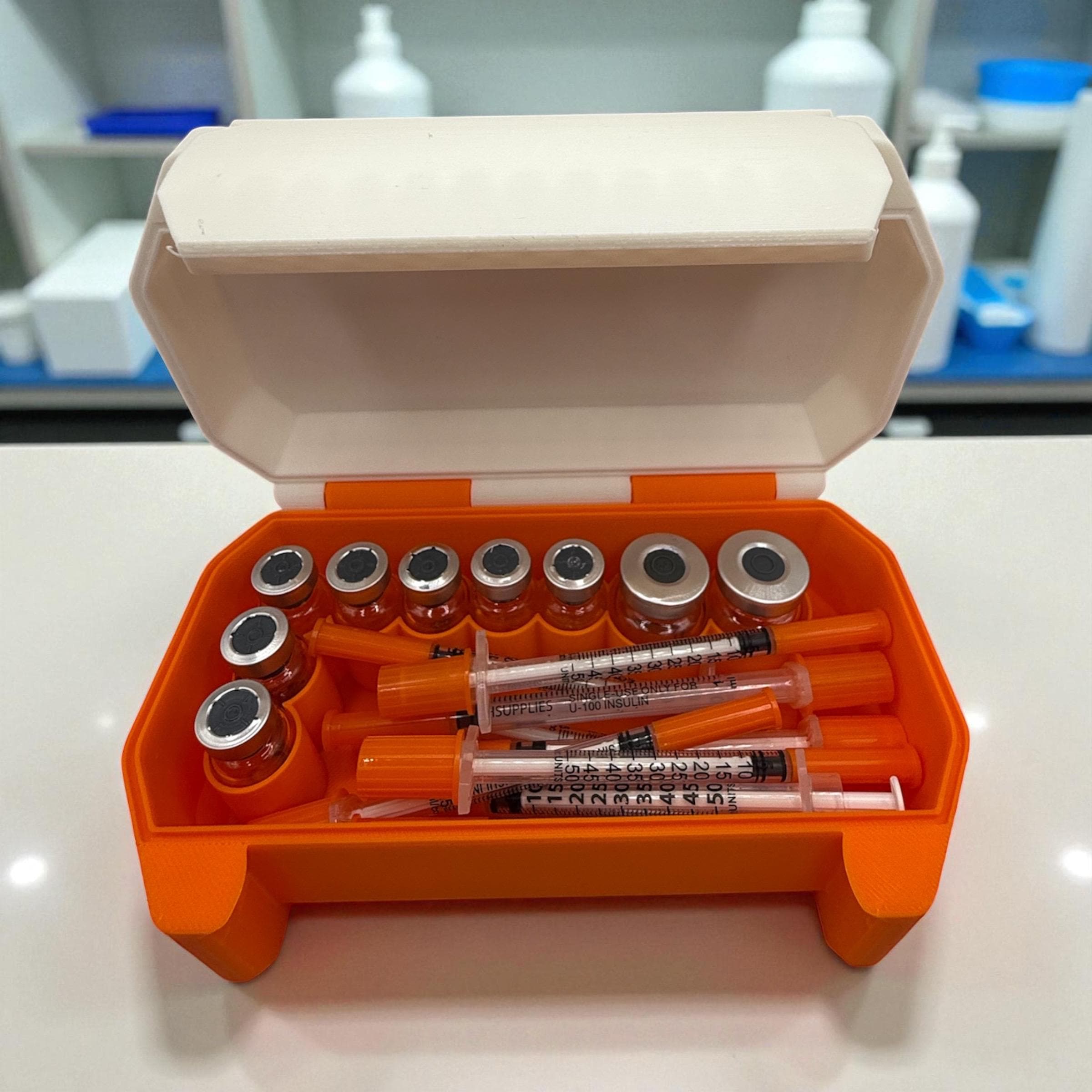Keep your vials safe, organized, and always within reach with our Super Small Vial Storage System. Perfect for collectors, labs, and hobbyists, this compact unit securely holds 7 x 3ml vials, 2 x 5ml vials, insulin syringes and alcohol pads. Despite its capacity, the storage system is portable and light weight.