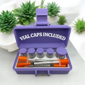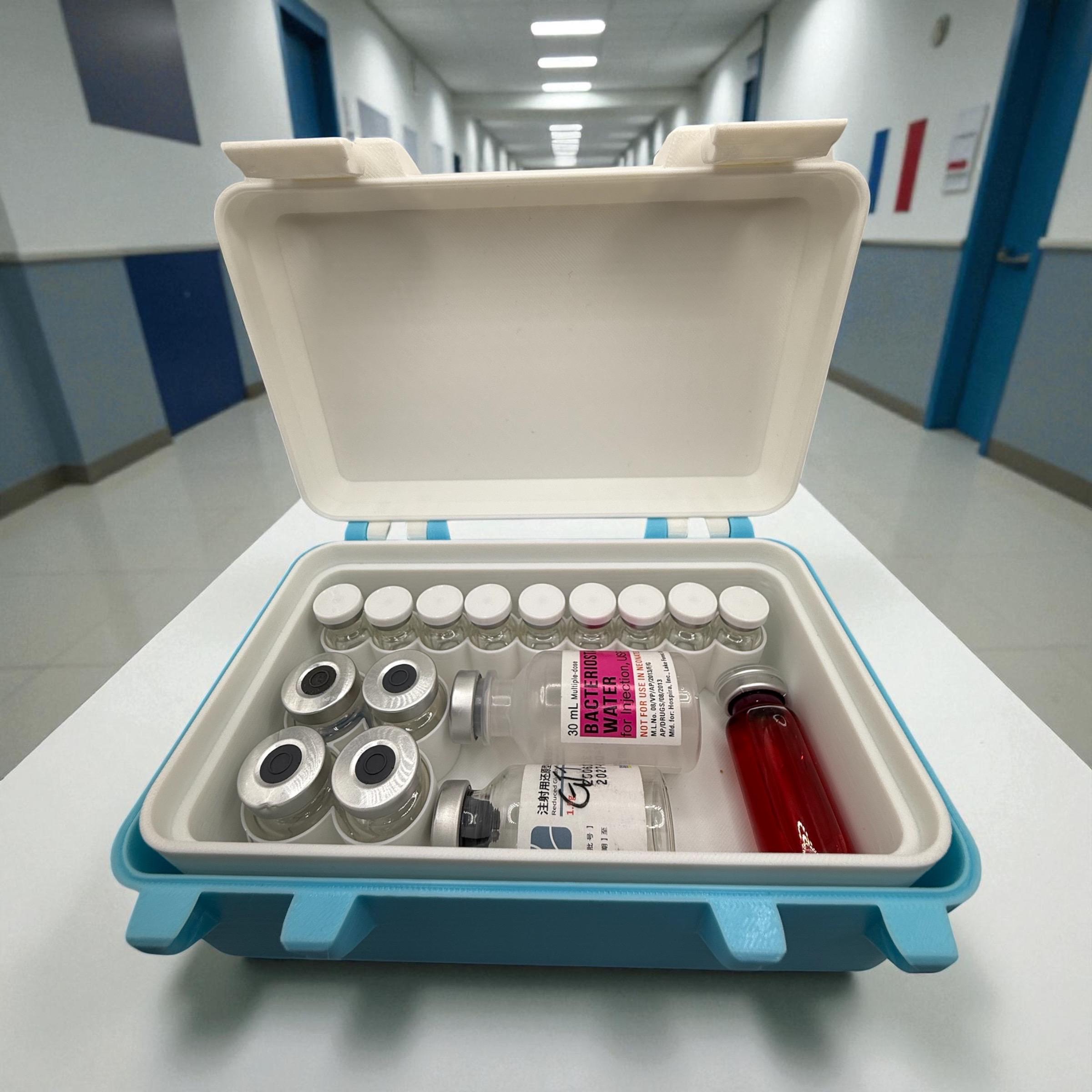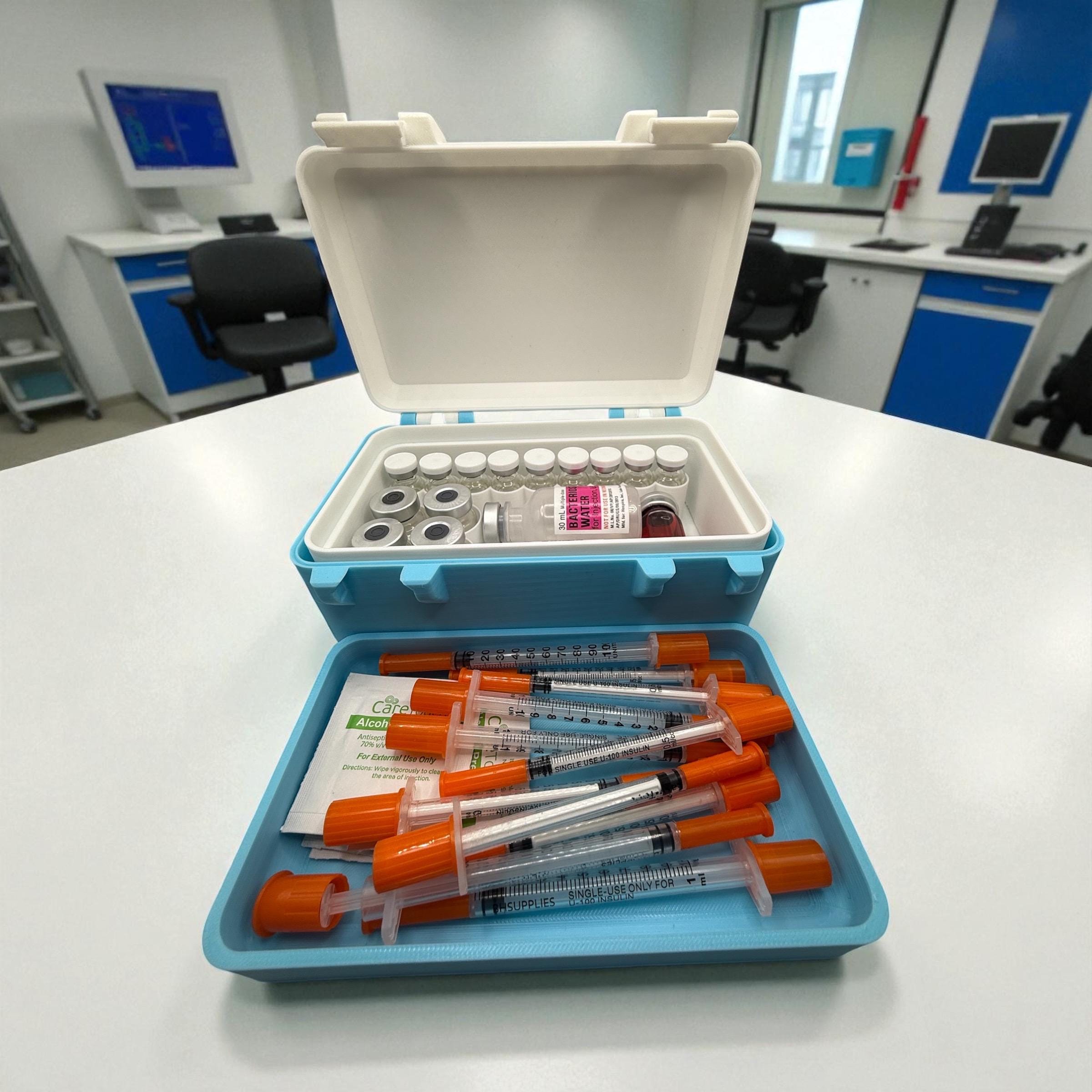 Keep your vials and supplies safe, organized, and always within reach with this compact storage box. Designed with custom compartments, it can hold multiple vial sizes, syringes, and alcohol pads in one secure case.