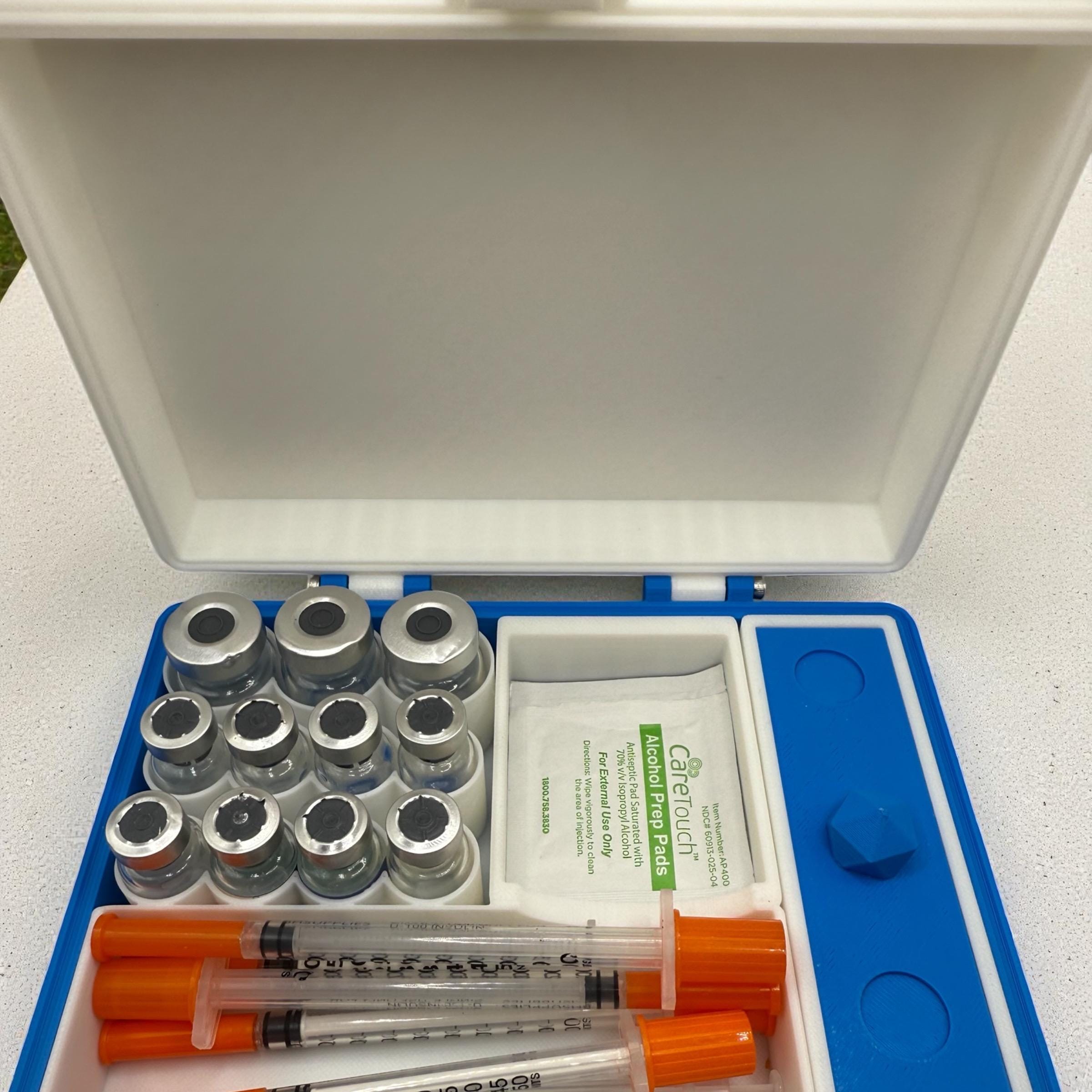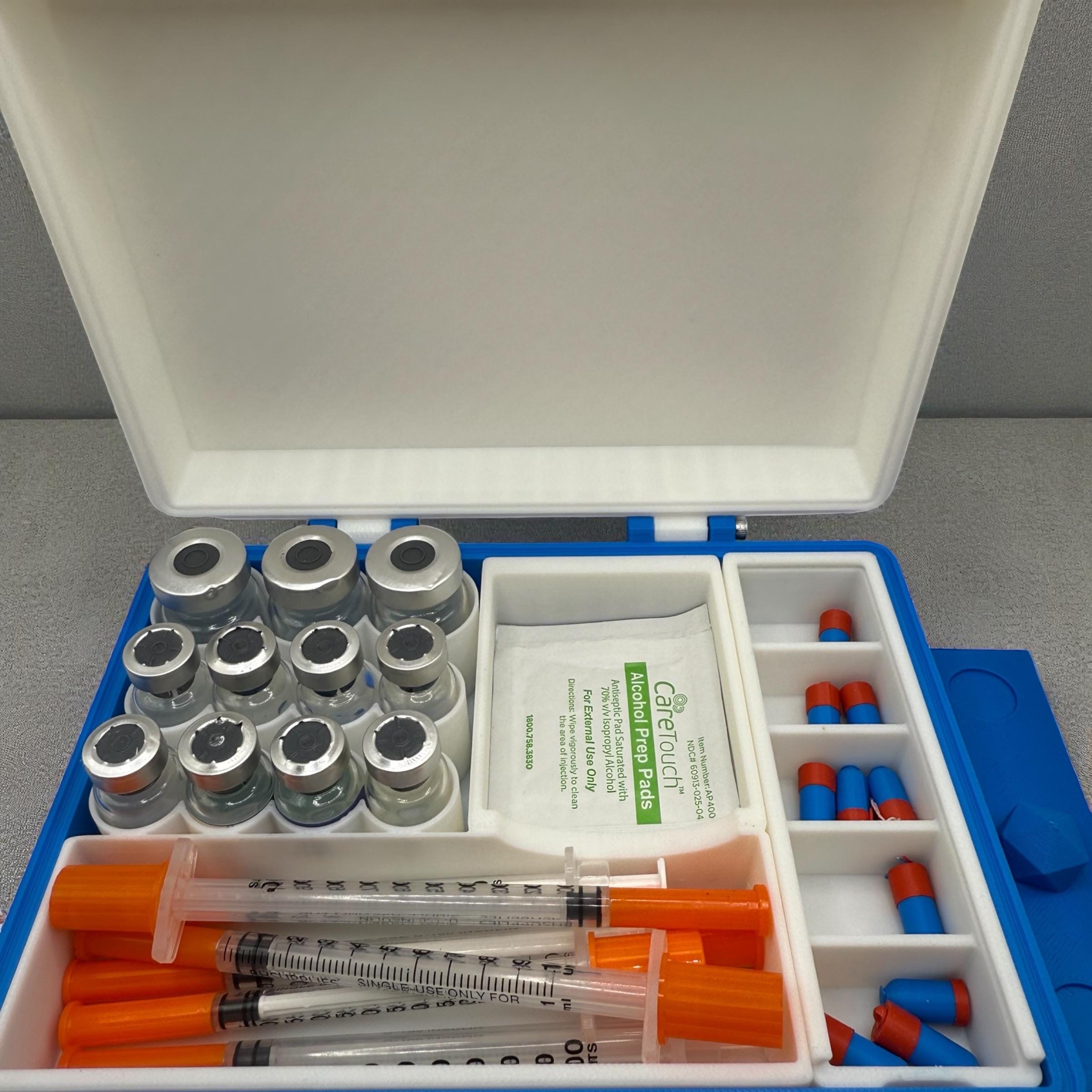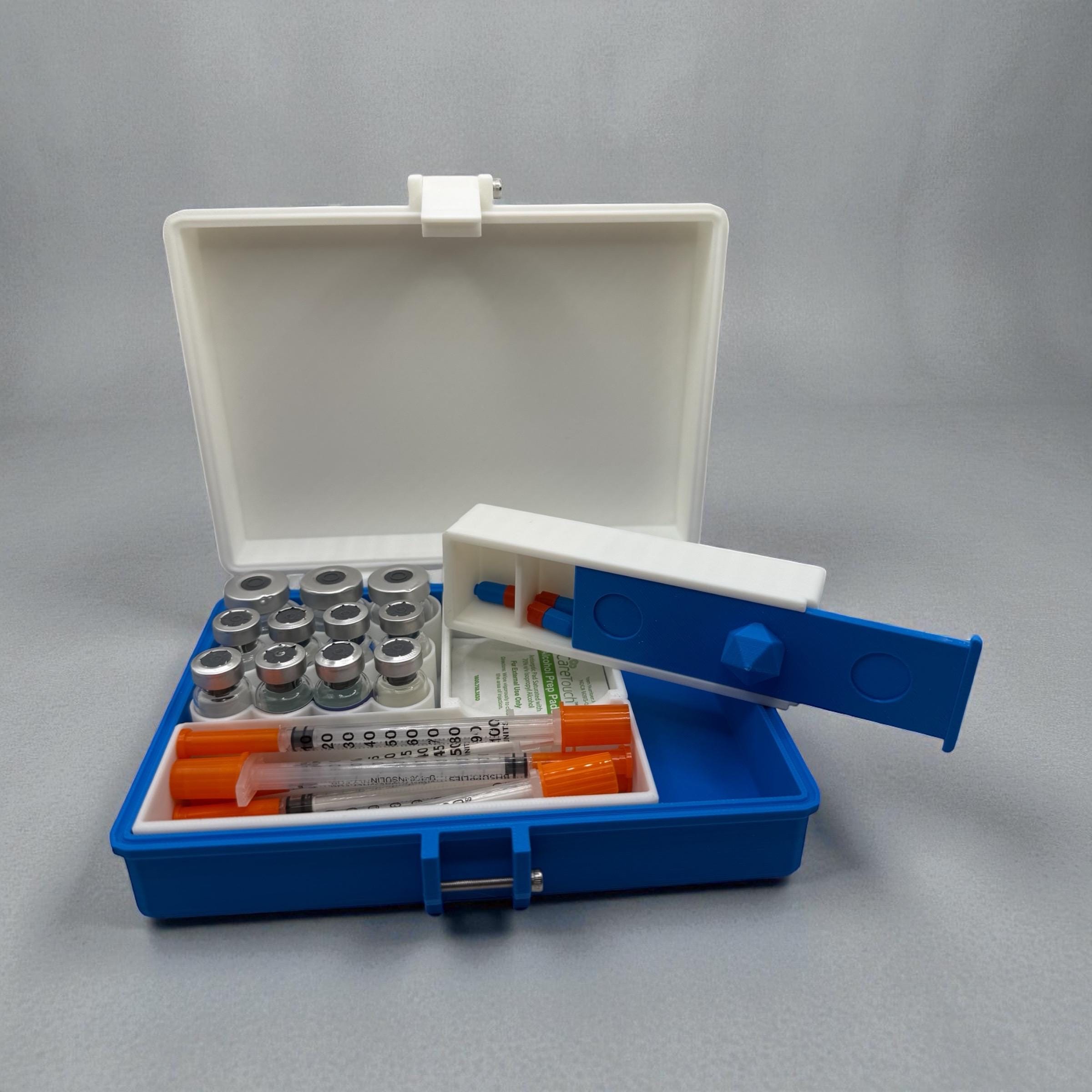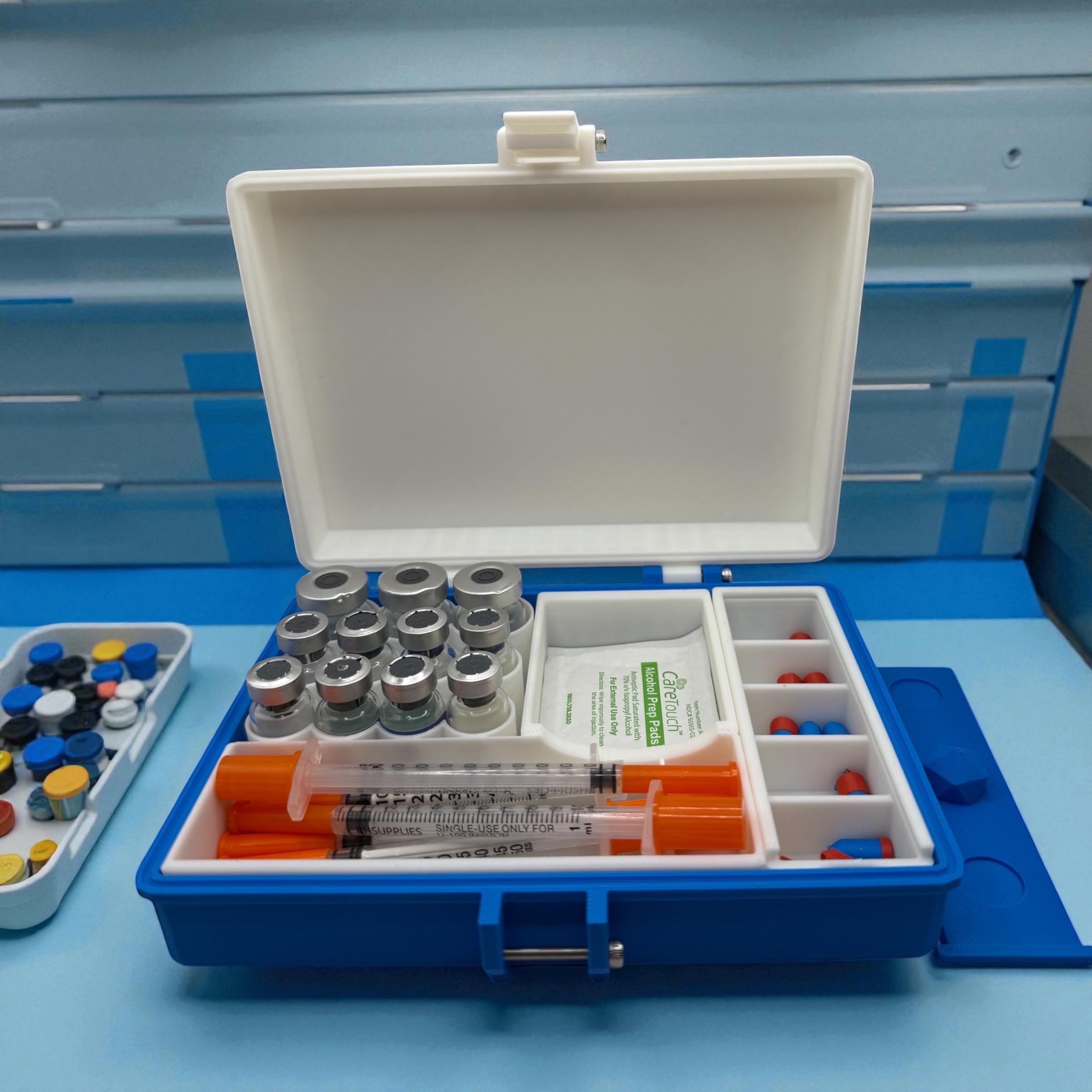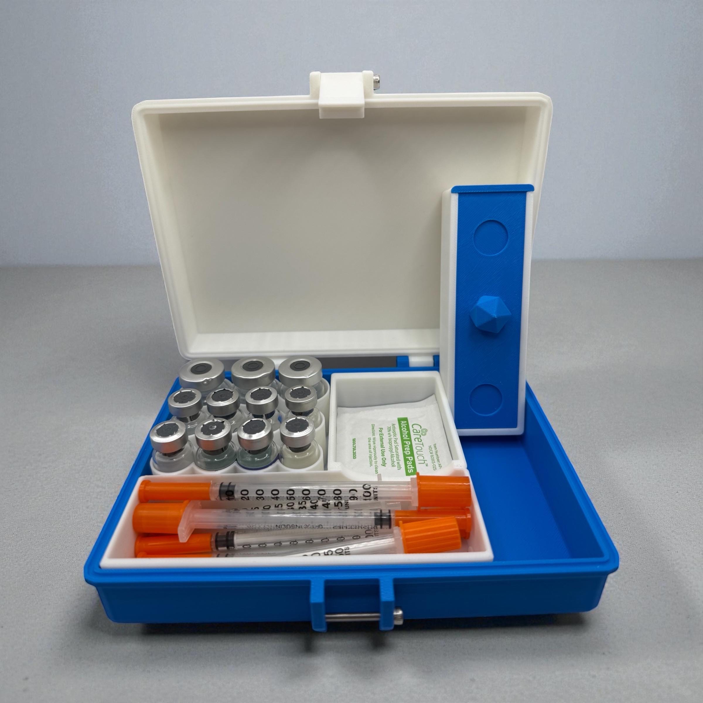 Keep your vials and supplies safe, organized, and always within reach with this compact storage box. Designed with custom compartments, it can hold multiple vial sizes, syringes, and alcohol pads in one secure case.