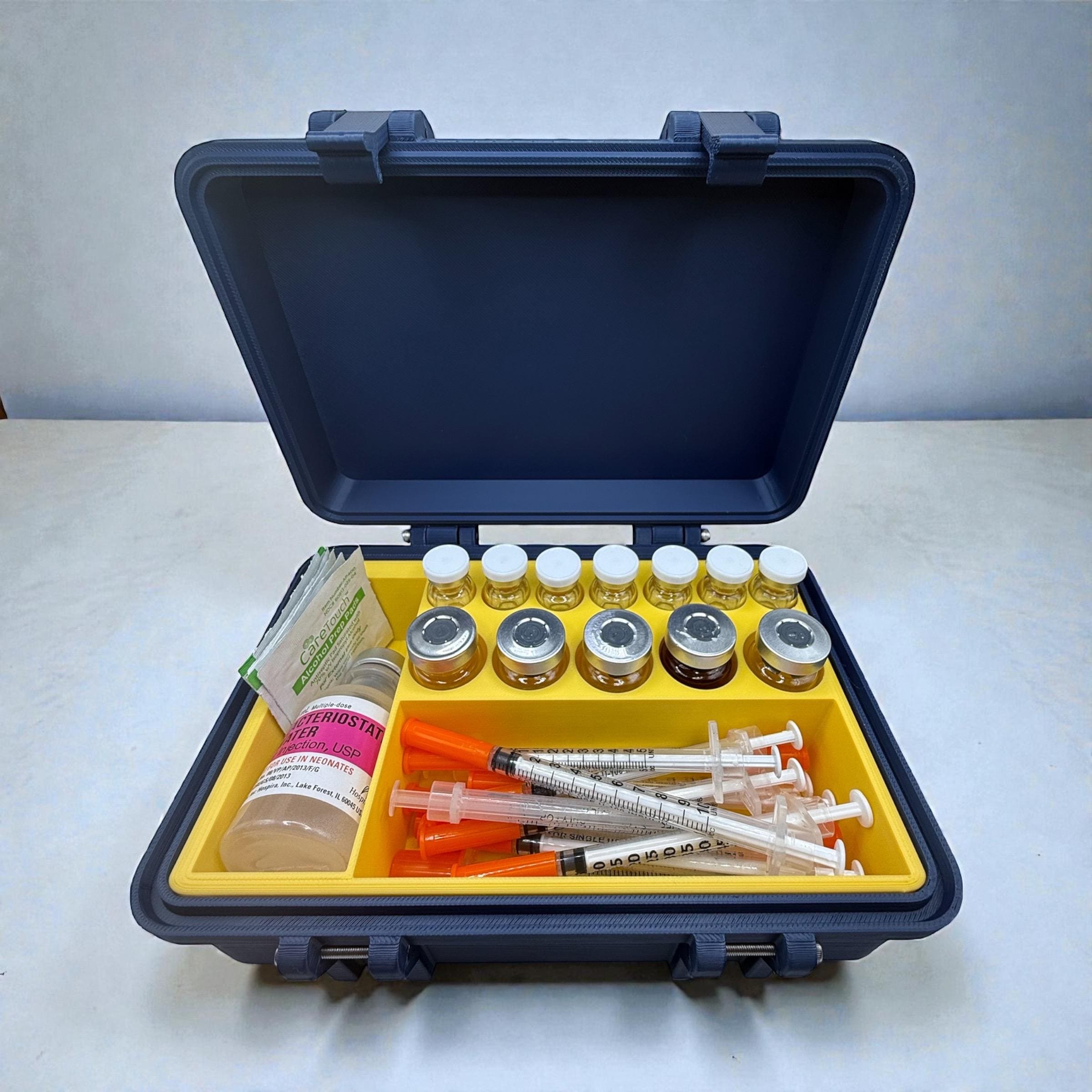 Keep your vials and supplies safe, organized, and always within reach with this compact storage box. Designed with custom compartments, it can hold multiple vial sizes, syringes, and alcohol pads in one secure case.