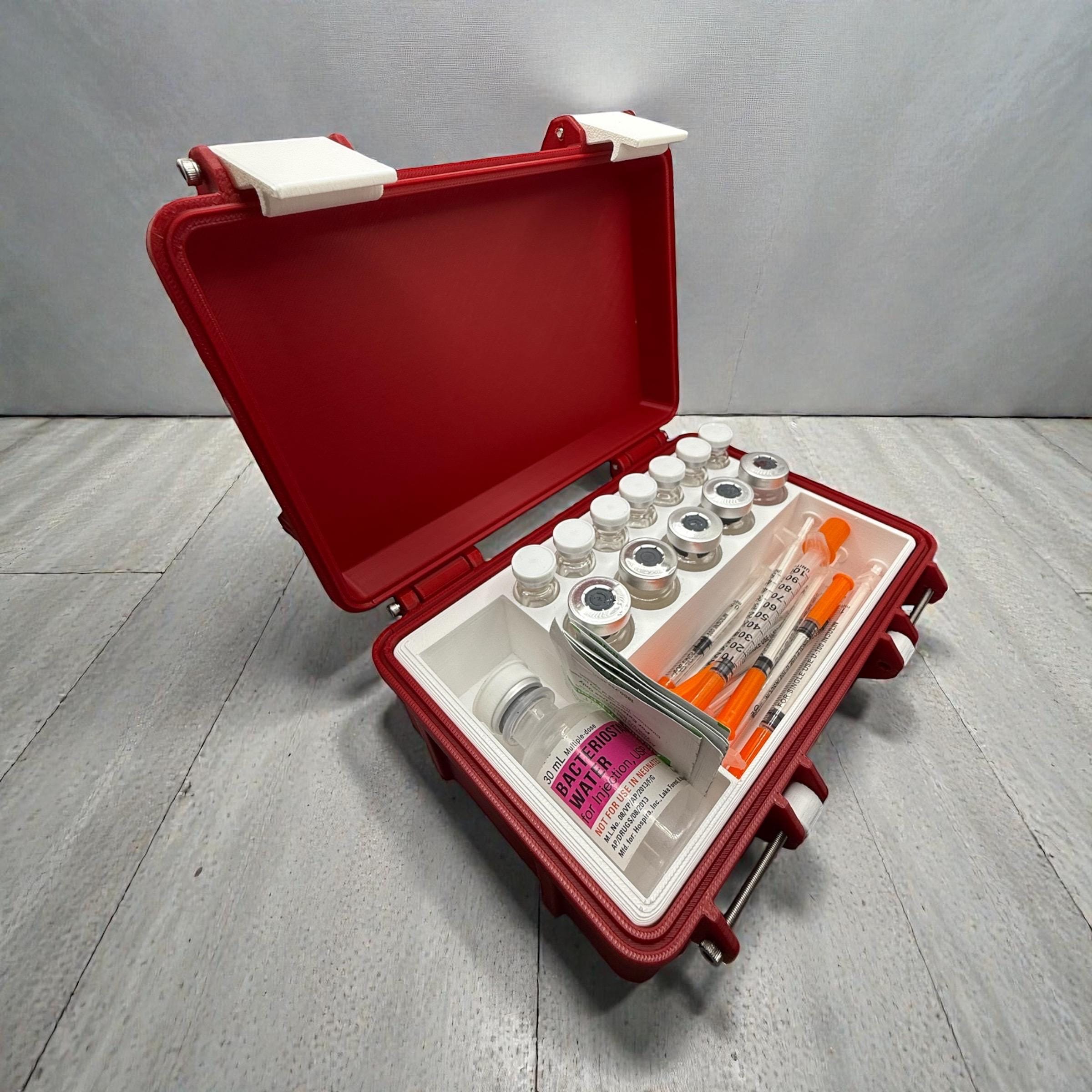 Keep your vials and supplies safe, organized, and always within reach with this compact storage box. Designed with custom compartments, it can hold multiple vial sizes, syringes, and alcohol pads in one secure case.